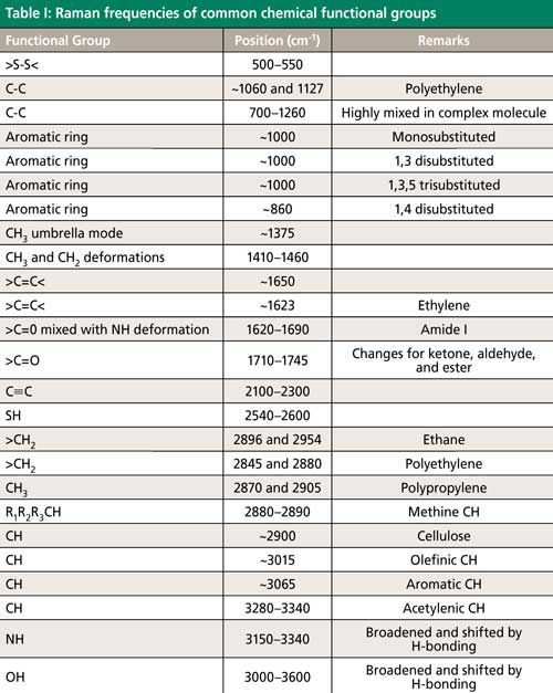 So with the limitations that we all have on our time and resources, how can we reasonably expect to use Raman spectroscopy effectively? You may be surprised to know that I am not a trained chemist, and I have struggled with the spectroscopy of chemicals for the simple reason that one needs to be able to speak the language; that is, you have to remember what name goes with what structure to understand what you are looking at and I am not good at memorization. (My formal training was in physics, because I understood that in that field, things were sorted out from first principles.) But slowly, over the years, I have learned to associate certain spectral features with simple functional groups. Table I summarizes some of what I have learned. But nowadays there are ways to get a handle on this using commercialized searching software and Raman databases. The examples that I present here use the KnowItAll software (Bio-Rad Laboratories) and their associated databases (8).