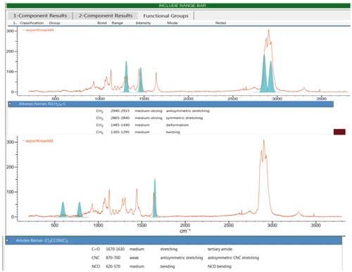 Suppose you really need to extract some information on chemical functionality. KnowItAll actually provides some capability to get you started. Figure 7 demonstrates that after a possible identification has been found, you can get some information as to the chemistry that would give rise to the found spectrum. The spectrum is shown twice in the figure so that one can see the correspondence between the functional groups and the spectral bands. What I found curious is that the NH band (near 3300 cm-1) is not identified in KnowItAll, at least for the polyamide polymer. Occasionally, it does identify an NH stretch, but for other functionalities, and at 3400 cm-1, much higher than what is seen here. Clearly, this capability will not take the place of an experienced spectroscopist (very few of whom still exist), but can get you started.