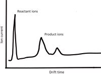 Figure 1: Simple ion mobility spectrum measurement of measured ion current (y-axis) versus travel time through the device (x-axis). Smaller reactant ions are well separated in drift time from larger product ions from the sample.