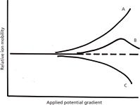 Figure 2: Differential ion mobilities as a function of applied field gradient. At low gradients, mobilities are independent of field, but at higher gradients, ions (A, B, and C) can exhibit several different behaviors that make the separation of similar species feasible.