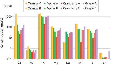 The results for the fruit juice samples are shown in Figure 2. In general, the mineral content does indeed vary among juice types, indicating that there is value in assessing the micronutrient concentrations of food. It can be seen that in some cases the concentrations of individual micronutrients can have differences of nearly two orders of magnitude from juice to juice, representing the differences in processing and the nutritional value of the ingredients used. When comparing the orange juices, “Orange-B” has a significantly higher Ca content than “Orange-A,” which supports the “Orange-B” label claim that this juice is fortified with calcium. Looking at the cranberry juices, “Cranberry-B” has a higher mineral content than “Cranberry-A,” which is expected since “Cranberry-B” is a 100% juice blend and “Cranberry-A” is a juice cocktail (that is, 25% juice).