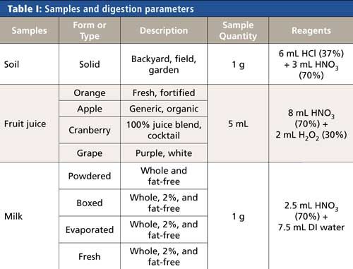 All samples were prepared via microwave digestion using a Titan MPS microwave sample preparation system (PerkinElmer Inc.) with standard 75-mL digestion vessels. Although most milks and juices are liquid and can potentially be analyzed without digestion, these samples were digested to break down the complex matrices and increase the accuracy and ease of analysis. The digestions for all types of samples were accomplished using the microwave program shown in Table II.