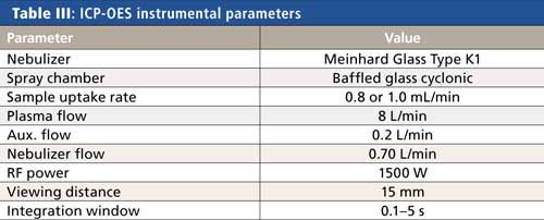 All analyses were performed on an Avio 200 ICP-OES system (PerkinElmer Inc.) using the conditions shown in Table III. Measurements were made against multipoint external calibration curves, where the standards were made up at the same acid concentration of the samples. With the excellent linearity of ICP-OES, the calibration standards did not have to bracket the concentration ranges being measured to deliver analytically precise and accurate results.