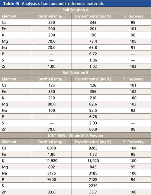 To verify the accuracy of the methodology for each matrix, certified reference materials were measured where available (Soil Solutions A and B, High Purity Standards; 1549a Whole Milk Powder, National Institute of Standards and Technology [NIST]), with the results appearing in Table IV. The recoveries for all elements in all reference materials are within 10% of the certified values, indicating accuracy of the methodology.