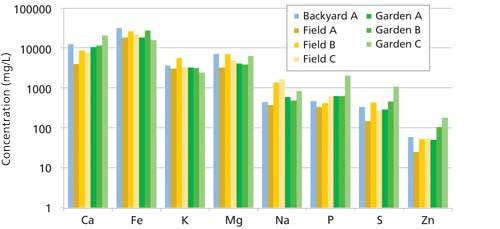Since all the soils were productive and collected from a relatively small geographic area, there was not an expectation of large variation in elemental concentrations between the samples, which was confirmed by analysis. It is interesting to note in Figure 1 that the “Garden C” sample appears to be recently amended with fertilizer, because the P, S, and Zn concentrations are well above the mean of the other samples. Although these samples did not display great variation, the usefulness and capability provided by direct analytical analysis of the micronutrient concentrations in soil would allow for the careful selection and judicious use of targeted micronutrient fertilizers when needed and help prevent both soil depletion and the damaging overuse of fertilizer.