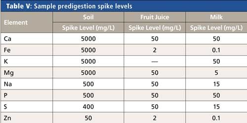 To assess any issues with the sample preparation process, all samples were spiked at the levels shown in Table V before digestion. Spike recoveries were not performed for potassium in the juice samples or calcium in the calcium-fortified orange juice since these were present at such elevated levels (as shown in Figure 2) that they obscure the spike signal and essentially eliminate the ability to calculate recovery values.