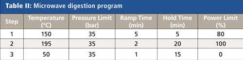Because the sample matrices differ, slightly different sample amounts and reagents were used for the digestion, as shown in Table I. Because of the complex nature of soils, the addition of hydrochloric acid to nitric acid was found to improve the extraction efficiency, and hydrogen peroxide added to nitric acid was beneficial in breaking down the high sugar content of the fruit juices. After the samples were added to the digestion vessels, predigestion spikes were added next (when used), followed by the digestion reagents. Before closure and heating, the vessels were left open for 10 min to allow any early reactions to occur safely. After digestion was complete, samples were transferred to autosampler tubes and diluted to a final volume of 50 mL or a final weight of 50 g with deionized water.