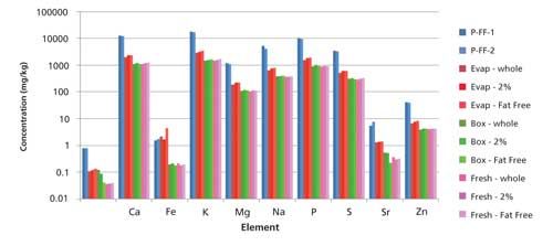 Various dairy samples were analyzed encompassing four dairy products (fresh, boxed, evaporated, and powdered milk) with three fat contents (fat-free [0%], 2%, and whole); the results appear in Figure 3. The powdered milk and evaporated milk samples have the highest micronutrient concentrations (as expected) because of the concentrated nature of the samples themselves. The fresh and boxed milks have similar micronutrient concentrations, demonstrating that ultra-heat treating the milk to create a shelf-stable product does not appear to negatively affect the mineral content. Finally, the mineral concentrations appear to be independent of the fat content, with the fat-free, 2%, and whole milks each having similar micronutrient concentrations for a specific milk type (that is, evaporated, fresh, and boxed).
