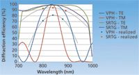 The first example is a high-dispersion grating well suited for Raman spectroscopy at a laser wavelength of 785 nm. The groove density of the grating is 1765 lines/mm (with a 566-nm period) and the angle of incidence in air is 50°. Ideally, the grating should provide polarization-independent high efficiency from 785 nm to 1000 nm. We used a finite element method (4) to solve Maxwell's equations combined with topological optimization (5) to find the best VPH and SRTG grating structures for this problem.