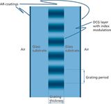 VPHs are typically manufactured in a dichromated gelatin (DCG) that is sandwiched between two glass substrates as shown in Figure 5. The DCG is transparent from ~350 nm through NIR, so VPHs generally cannot be made for UV spectroscopy. The refractive index of DCG can be changed permanently by illumination with laser light. The permanent index modulation is created in the DCG by illuminating the material with an interference pattern (holographic technique). The thickness of the grating is simply the thickness of the DCG layer. The index modulation and average index can be controlled by the exposure intensity or exposure time of the illumination. Unexposed DCG has a refractive index of 1.54 and strongly exposed DCGs yield a minimum average index of ~1.25 and a maximum index modulation of ~0.15.