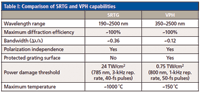 With the parameter space available by the manufacturing techniques described above, both SRTGs and VPHs can provide high-efficiency, polarization-independent diffraction gratings. In general, SRTGs provide high index modulation (>0.25) and VPHs provide lower index modulation (<0.15). This means that VPHs typically require thick gratings (t > 5λ) and SRTGs require thinner gratings (t < 2λ).