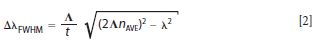 So far, we have only considered the grating efficiency at a single wavelength. However, a spectrometer needs to analyze a range of wavelengths around the center wavelength. From the article by Baldry and colleagues (2) the full width at half maximum (FWHM) bandwidth of the grating can be calculated by