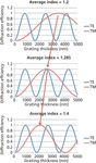 Figure 2 illustrates the effect of the average refractive index. The figure shows the diffraction efficiency versus grating thickness for three different average indices and constant index modulation. First of all, the diffraction efficiency of both the transverse electric (TE) polarized and the transverse magnetic (TM) polarized wave oscillates between 0% and 100% efficiency with varying grating thickness. However, while the period of the oscillation of the TE diffraction efficiency is almost independent of the average index, the oscillation of the TM diffraction efficiency depends strongly on the average index. For certain values of the average refractive index (for example, 1.285 in Figure 2), the TE and TM can peak at the same grating thickness. This situation is naturally very desirable because it provides a polarization independent efficiency around the center wavelength.