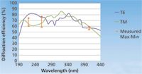 The second example is a broadband UV grating for the 190–435 nm wavelength range. This grating has a groove density of 2420 lines/mm (period of 413 nm). Since this is a UV grating we have only considered a SRTG. Figure 7 shows the theoretical grating efficiency as well as the efficiency measured at three different wavelengths. The error bars indicate the total spread of efficiency over more than 60 individual gratings. As can be seen, the efficiency is high for both polarizatons and fairly flat across the complete range from 190 nm to 435 nm.
