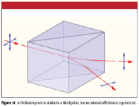 The Nicol prism (Figure 10) takes advantage of this phenomenon. Formed by two calcite prisms having a 68° angle, as the o-rays and e-rays diverge, the o-rays internally reflect at the inner boundary and are directed away. The e-rays emerge, linearly polarized and slightly shifted in path. A Wollaston prism (Figure 11) is similar in effect but does not involve internal reflection of the o-rays.