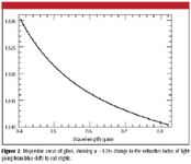 Note in Figure 1 that the higher-energy (blue) light is refracted more than the lower-energy (red) light, implying that the index of refraction for blue light is higher than the index of refraction of red light — such is the general trend for most transparent materials. This property is referred to as dispersion, and a dispersion curve is a plot of the refractive index versus wavelength (Figure 2). If dispersion did not exist, prisms would not separate the different wavelengths of light. (On the other hand, because of dispersion, certain optical components like lenses will separate differing wavelengths of light and direct the light rays in slightly different directions. This effect is usually undesirable and is called chromatic aberration.)