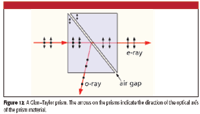 A Glan–Taylor prism (Figure 12) is a common polarizing prism that separates the e-ray from the incoming beam. It is composed of two right triangles of calcite or other birefringent material. The optical axis of the birefringent material is collinear with the polarization of the e-ray, and the two prisms are separated by a small space. In this prism, only the extraordinary ray is transmitted, while all of the ordinary ray and only some of the extraordinary ray is internally reflected. A Glan–Foucault prism is similar, except that in this case, the optical axis of the calcite is perpendicular to that of the Glan–Taylor prism. The extraordinary ray coming out of this prism has a polarization 90° from that of the Glan–Taylor prism. Finally, the Glan–Thomson prism is the same as a Glan–Foucault prism, except that the two right-angle prisms are glued together. This prism works the same way as the Glan–Foucault prism, but it has a lower limit of light input due to the potential for damage of the glue by the incoming light.