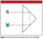 A Porro prism takes advantage of two internal reflections to reverse the direction of incoming light (Figure 5). The image inverts top and bottom but does not exchange left and right.