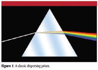Between 1666 and 1672, Isaac Newton performed his seminal experiments on white light with prisms. He was able to demonstrate conclusively that white light was in fact a composite of all colors, and that the prism itself only separated the colors. Newton was taking advantage of the fact that a prism disperses light; that is, it separates a range of wavelengths into its component wavelengths. A prism disperses as a result of two issues. First is Snell's law (3), which relates the angle of incidence θi to the angle of refraction θr for light impinging on a surface at some angle to the index of refraction of the two media involved: