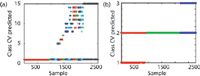 A number of comprehensive chemometrical approaches, including classical least squares, inverse least squares, partial least squares, principal component regression, least-squares support vector machines, and artificial neural networks, were applied directly to the data to discriminate the components of the mixture (27–29). However, these attempts did not effectively separate the classes because of the high level of heterogeneity of blood and semen. Here, we present the results of the SVM classification and describe the weaknesses of its straightforward application. During the first stage of analysis, we assigned a total of 15 classes for all of the mixtures and pure body fluids (Figure 2a; the x-axis corresponds to the number of samples, and the y-axis corresponds to the predefined class). The calculations revealed that a significant part of the mixtures was misclassified as pure blood or semen. However, when we performed the same calculations using only three classes (pure semen, mixture, and pure blood), approximately 40% of the blood and semen samples were misclassified as a mixture (Figure 2b).