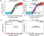 Figure 3: (a) Blood contributions in a semen/blood mixture calculated using SVM regression. Blue crosses and red triangles represent the Raman spectra of pure semen and blood, respectively. Different types of symbols correspond to different mixtures. (b) The selection of Raman spectra for the following SVMDA classification. The first and second groups include the Raman spectra of pure fluids only, while Raman spectra of mixtures distinguishable from the first two groups compose the third group. (c) Cross-validated results of the SVMDA classification. (d) SVMDA analysis of the experimental Raman spectra, including those omitted during the classification model development stage (b). Each symbol corresponds to a single Raman spectrum.