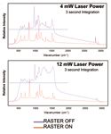 Furthermore, the effect of localized heating damage on SERS substrates is demonstrated in Figure 1 via the hashed, horizontal line on the y-axis. When ROS is not used, the background increases substantially. The constant movement of the laser spot with ROS turned on (lower spectrum) minimizes sample damage caused by localized heating from a static, focused laser spot. Therefore, ROS enables the use of higher laser power without degrading the quality of the Raman measurement.