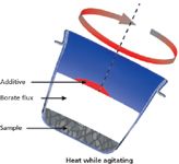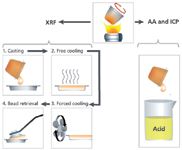The borate fusion technique shown in Figure 9 consists of mixing a ground sample with a borate flux (lithium or sodium) inside a 95% platinum, 5% gold crucible, heating to about 1000 °C with agitation until the flux melts, and then dissolving the sample homogeneously in the flux (10). The choice of lithium borate or sodium borate depends on the application, but lithium borates are more commonly used because of the greater retention of moisture on the surface of the glass disks with sodium borate flux, and the desire to analyze for sodium. Lithium borates exist as lithium tetraborate (Li2B4O7), and lithium meta-borate (LiBO2). It is not necessary to melt the sample, so temperatures above 1100 °C are not necessary and can adversely affect the retention of volatiles and flux. A nonwetting agent (bromide or iodide) can be added when integrated into the flux, or independently, depending on the application. All oxides dissolve in borate flux, so it is essential to make sure the sample is oxidized. Metals alloy with the platinum forming a eutectic, which lowers the melting point of the platinum and results in its destruction. If the sample is not oxidized fully, it may be necessary to add an oxidizer to the sampleâflux mixture, and heat at a lower temperature to start, and then raise the temperature after the oxidation process has taken place. Careful observation of the oxidation process will allow commonly analyzed volatiles such as sulfur (9,10) and even chlorine to be analyzed. After the sample is completely dissolved in the flux, the casting process can be performed by pouring the melt into a heated 95% platinum, 5% gold mold. This particular alloy of platinum is chosen to prevent wetting (sticking) of the bead to the mold. The cast glass disk is cooled quickly at first to freeze the bead in the amorphous (glass) state, and then it is cooled faster over a period of time with forced air to relieve the stresses in the glass disk from the initial drop in temperature when first cast and to allow the bead to be retrieved by hand for analysis. The entire process is shown in Figure 10. Glass disks made from different materials and cast into molds of different sizes are shown in Figure 11 along with their crucibles.