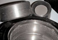 Now that the question of "How long should I grind?" has been answered, we can take a closer look at the grinding and pressing (also known as briquetting or pelletizing) process. There are many different types of grinding equipment, and the size of the specimen and briquette have to be taken into consideration when choosing one, as well as the standard sizes and characteristics of the manufacturer of the XRF instrument being used. The typical size of a briquette made for a typical XRF spectrometer ranges from 30 to 40 mm in diameter, and involves about 5 g of sample and 1 g of binder. Figure 7 shows a briquette (pressed pellet) of cement. The powder was poured into an aluminum cap to provide stability to the pellet. Also shown are the ring, puck, and container in which the specimen was ground. The weight and motion of the ring and puck mill are quite efficient for reducing most oxide materials down to about 30â40 µm particle size in about 3â4 min. Grinding further will lead to agglomeration of the particles, thus defeating the purpose of the grinding exercise. Adding a binder is necessary for the stability of the briquette, depending on the friability of the material. Anzelmo and colleagues (8) describe adding a grinding aid that greatly facilitates the uniformity of the particle size reduction, eliminates contamination from the grinding media and from the sample sticking to the grinding media, speeds up the cleaning process, and reduces dust during the cleaning process. Manual or automatic presses operating between 20,000 lb and 40,000 lb have been found adequate as long as the time of the pressing procedure remains constant. After the grinding equipment, additives, and backing equipment are decided on, the final step is to determine the optimum grinding time, given the goal of achieving the correct effective layer thickness for all wavelengths of interest. Figure 8 shows plots of grinding time versus intensity for various briquettes. The intensities are changing with different grinding times, so in addition to finding the time to achieve the appropriate effective layer thickness for each wavelength of interest, it is desirable to find a time when intensities are not changing drastically with time.