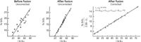 These samples are difficult if not impossible to matrix-match with standards. An everyday example of this problem is the analysis of SiO2 in raw mix used in the manufacturing of cement (9,10). The plot on the left in Figure 12 shows the calibration curve made for SiO2 in raw mix from three cement plants (denoted by the triangle, circle, and x symbols). The scatter around the line is unacceptable and cannot even be made into straight lines by separating out each plant. Mathematical interelement corrections will not improve this situation because the problem is not from absorption-enhancement effects; it is from the mineralogical effect and can only be solved by fusion. The middle plot shows that the points have now moved very close to the line after fusion, giving acceptable accuracy expectations when analyzing unknowns. The plot on the right shows even more improvement after mathematical corrections are applied. Mathematical corrections are now possible because the larger, dominating error from the mineralogical effect has been removed, allowing the smaller error from absorption enhancement to be reduced (and to be able to see the improvement).