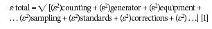 Equation 1, the analysis of variance, shows contributions of the various components making up the analysis system. Analysis of variance (3) shows that the total error is equal to the square root of the sum of the squares of error of the individual components of the error; that is, the error from the counting statistics, the power source, the spectrometer, the macro sampling process, the specimen preparation process, the reference standards used for calibration, the type of correction algorithms applied and the decisions made when making those corrections, and everything else. Everything else can include the temperature, humidity, vibration, and dust in the laboratory and surroundings. These components contribute both random and systematic error. It is the job of the analyst performing the method development to minimize random errors and remove the systematic errors, which are generally quite large and easy to remove by an experienced spectroscopist. In fact, because of the advances made in the stability of the generators, tubes, and electronics, the accuracy of the goniometers, and the empirical and theoretical correction algorithms available in the software, the largest error now comes from standard selection, sampling, and specimen preparation. Therefore, the choice of method and application of technique when performing the specimen preparation is of paramount importance to the final accuracy of the analytical method. Notice the word accuracy is used here and not precision. In fact, it is possible when using XRF to choose a method where the precision will be very high but the accuracy will not be acceptable. The differentiation between precision and accuracy needs to be well understood when working with XRF, and will be discussed below.