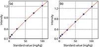 Figure 1: Calibration curve for each material of Micro-Z ULS; (a) diesel fuel, (b) isooctane (for gasoline).