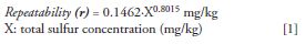 Repeatability tests were carried out using a representative sample for each material. For each sample, two aliquots were prepared and analyzed using the calibration Figure 1; this process was repeated 20 times. The term "r" represents "repeatability" defined by the following formula in ASTM D2622-10 (1):
