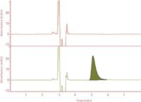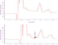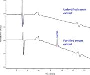 Figure 4: Chromatograms of unfortified (top trace) bovine serum extract and fortified bovine serum extract (bottom trace) obtained with isocratic elution.