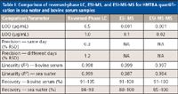 Table I: Comparison of reversed-phase LC, ESI-MS, and ESI-MS-MS for HMTBA quantification in sea water and bovine serum samples