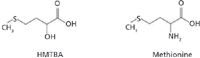 HMTBA and its isopropyl ester has been shown to be a highly effective dietary methionine supplement in dairy cows, poultry, and aquaculture (1–10). It has been shown that both the D and L enantiomers are converted to L-methionine (L-Met) through a stereospecific transamination pathway (11–13). The relative efficacy of uptake of racemic HMTBA and D,L-Met have been investigated in several studies; efficacies in such studies have been established through growth rate assessment in poultry or milk production rate in lactating cows. Studies show that HMTBA or its isopropyl ester supplementation yield higher growth rates and higher milk yields than Met supplementation (13,14). Uptake of HMTBA and its subsequent conversion to methionine has been studied in lactating dairy cows with infusion of 13C-labeled HMTBA. It was shown that infusion of HMTBA increased whole-body plasma flux of Met (15). It has been postulated that uptake of Met and HMTBA from the gastrointestinal track involve different mechanisms; Met uptake involves an active transport across the cell membrane and HMTBA uptake occurs through diffusion, this uptake is more efficient especially when animals experience stress, for example, heat stress. It has also been shown that HMTBA can lead to increased production of antioxidant metabolites such as taurine and reduced glutathione (16). However, experiments that link HMTBA supplemented in feed directly with its concentration in blood serum have not been reported in literature.