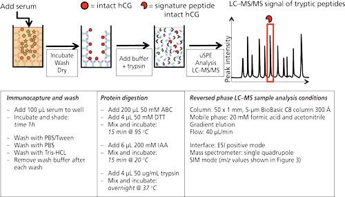 Figure 2: 96-well plate format for the immunoextraction of hCG from serum. Anti-hCG antibodies are immobilized on the wall of a microtiter plate. hCG in serum will be captured by these antibodies and remain in the well after extensive washing. Trypsin will digest the captured hCG, yielding a clean sample, after which μSPE can be injected into the LC–MS system. Typical experimental conditions are given in the lower part of the figure [from (14)].