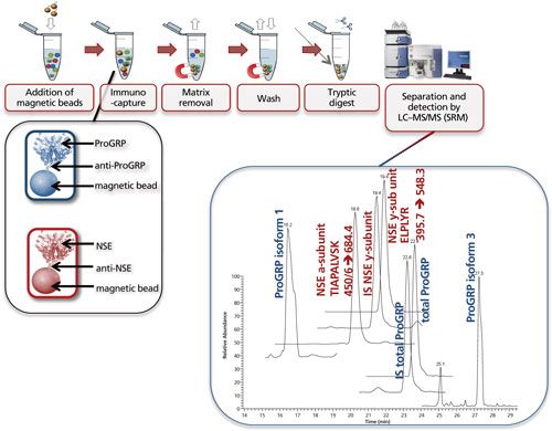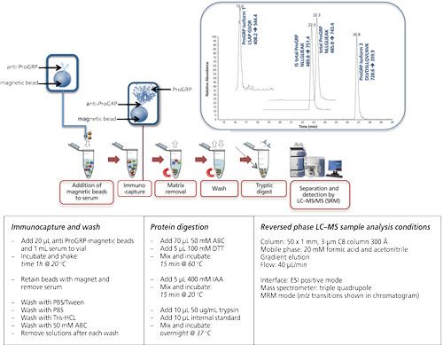 Figure 5: Immunocapture of ProGRP using anti-ProGRP antibodies coupled to magnetic beads. Large sample volumes can be used in the capture of ProGRP. Using a magnet the beads, with the captured ProGRP, can be retained. After extensive washing trypsin can be used to digest ProGRP. This digested sample can be injected into the LC–MS system. This approach allows determination of the total amount of ProGRP as well as quantification of ProGRP isoform 1 and ProGRP isoform 3. Internal standard (IS) for total ProGRP is included in this method (23). Typical experimental conditions are given in the lower part of the figure. The chromatogram shown is that of a spiked serum sample.