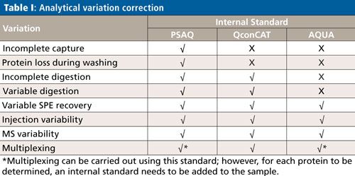 Although the subject of calibration is not within the scope of this overview, it is important to be aware that quantification in targeted protein analysis is not as straightforward as quantification of small molecules. To be able to perform an accurate quantitative analysis of the target protein (or proteins), there are several internal standard calibration strategies that can be applied: AQUA (Absolute QUAntification), PSAQ (Protein Standard for Absolute Quantification) and QconCAT (concatamer of standard Q-peptides). The goal of these strategies is to eliminate variations in the analytical process, which comprises capture, cleanup, digestion, SPE, and an LC–MS step. Table I shows which of the analytical variations are eliminated per standard calibration strategy.