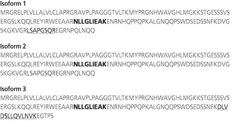 Figure 6: Amino acid sequence of three ProGP isoforms. Each isoform contains the sequence NLLGLIEAK (in bold), which is used to determine the total amount of ProGRP. Isoform 1 and 3 each have a detectable signature peptide (LSAPGSQR for isoform 1 and DLVDSLLQVLNVK for isoform 3) that allows differentiation.