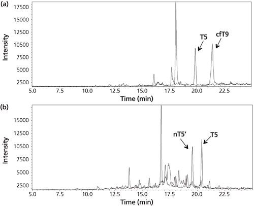 Figure 4: (a) Chromatogram for the analysis of the urine of a woman pregnant in the third month. The peaks correspond to the signature peptides for intact hCG (T5) and core fragment hCG (cfT9). (b) Chromatogram from the analysis of a cancer patient serum sample. The peaks correspond to the signature peptides for intact hCG (T5) and hCG nicked 44/45 (nT5’). Adapted and reproduced with permission from reference 14.