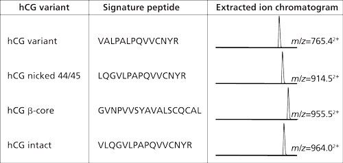 Figure 3: Four of the isovariants of hCG. All these have their specific signature peptides with their specific m/z value and retention behavior. Within a single analysis these four isovariants can be monitored simultaneously (14).