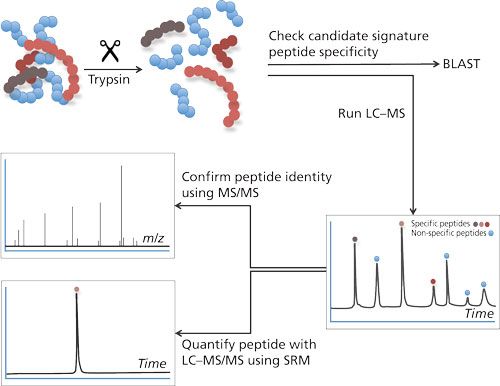 Figure 1: Bottom-up approach in LC–MS-based analysis. Proteins are digested into peptides. Specificity of these peptides for its parent protein can be evaluated using Basic Local Alignment Search Tool (BLAST: http://blast.ncbi.nlm.nih.gov/Blast.cgi?PAGE=Proteins). LC–MS/MS analysis will allow peptide identification and quantification.