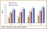 SDI disaggregates the spectroscopy market into three distinct sectors: molecular spectroscopy, atomic spectroscopy, and mass spectrometry. The applications of the techniques included in each sector and their prospects differ significantly, even within each sector. Overall worldwide revenues in the spectroscopy area totaled about $5.7 billion in 2004, or about 22% of the total laboratory analytical and life science instrument market. The overall spectroscopy market is estimated to have grown about 5.9% in 2004, an improvement over the previous year's growth. SDI predicts that the market will expand slightly faster in 2005, growing at about 6.1%, which is a continuation of a three-year trend.