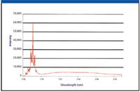 Integration time for the measurement was 50 ms. The resultant emission spectrum shows sharply defined spectral peaks at wavelengths as low as 153 nm, with a strong central peak around 161 nm (Figure 1). The system operated with a spectral resolution of 0.1 nm and a signal-to-noise ratio of 450:1.