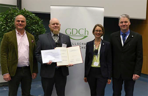 Presentation of the Bunsen-Kirchhoff-Award of the German Chemical Society (GDCh) to Shelley at the 2017 ANAKON conference. (L to R) Dr. Martin Greber (Perkin Elmer), Prof. Jacob T. Shelley, Prof. Kerstin Leopold (DAAS GDCh), Dr. Wolfgang Buscher (DAAS GDCh) (photo courtesy of Carsten Engelhard).