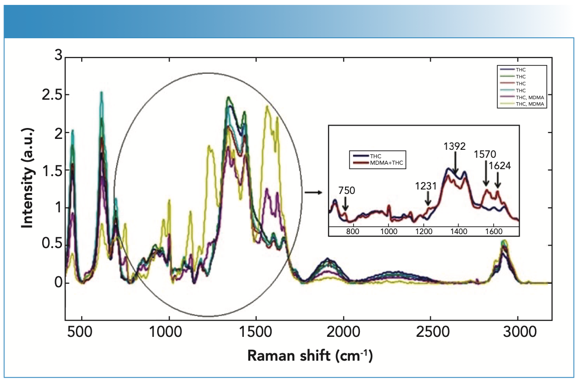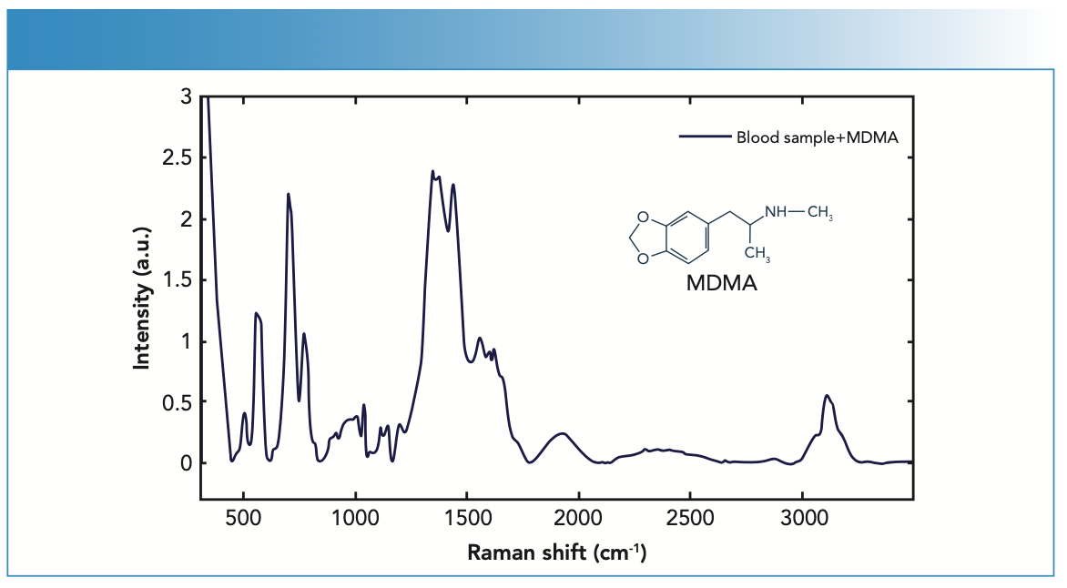 The MDMA peaks differed in a blood sample taken from a person using both MDMA and THC (Figure 4). The most noticeable Raman peaks that distinguished MDMA from THC were found at 750, 1231, 1392, 1570, and 1624 cm-1. These bands can be used to confirm the presence of MDMA. The Raman band at 1624 cm-1 corresponded to vibrations of NH deformation.