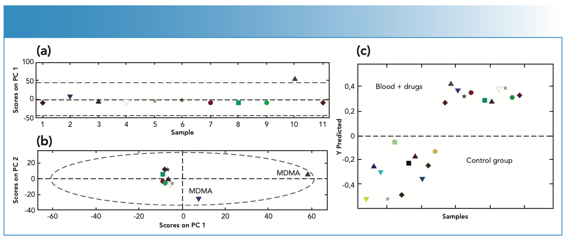 The PCA method was used for the analysis of 11 blood samples (2 MDMA, 1 THC + MDMA, and 8 THC), which were determined to be different drugs. Second, the PLS-DA method was used to optimize the separation between drug-containing and drug-free blood.