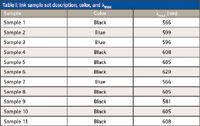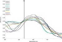 A critical early determination of the current study was whether the signal enhancement noted in the ink samples included a resonant Raman effect. This question is readily addressed using UV–vis absorption spectroscopy. The resulting spectra are shown in Figure 1 and the maximum of each is shown in Table I. All the inks, both blue and black, had absorption maxima centered roughly around 600 nm. Using these spectra as a guide, we chose the 532-nm laser for the DXR spectrometer to gain the best sensitivity for the experiment versus the 633-nm laser. Whereas either the 532-nm or 633-nm laser would work well in terms of the resonant effect, the sensitivity increase from the higher frequency laser was desirable. The 780-nm laser was not chosen because all of the electronic transitions are at higher energy for these samples and would likely lead to a loss in sensitivity.
