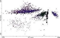 Figure 5: Principal component scores plot of PC1 versus PC5 showing discrimination between ink classes. This figure only shows one dimension of the discrimination solution so not all the classes are fully separated in this plot.