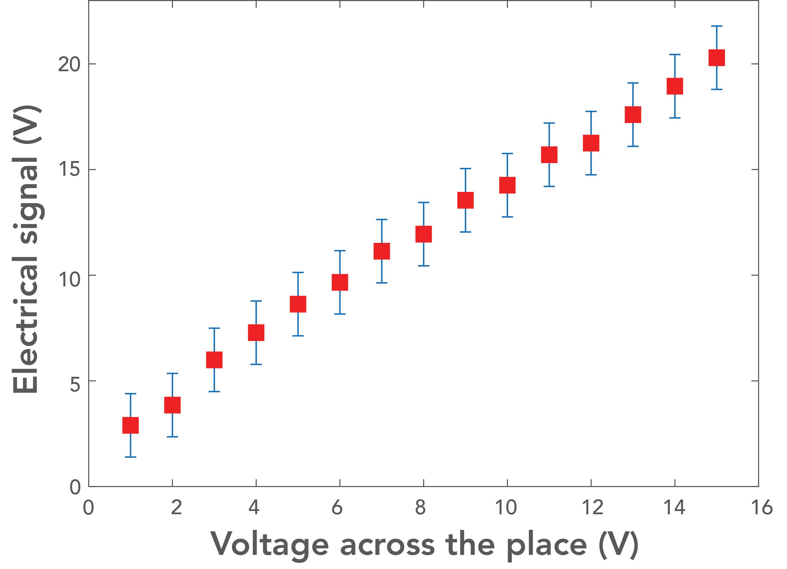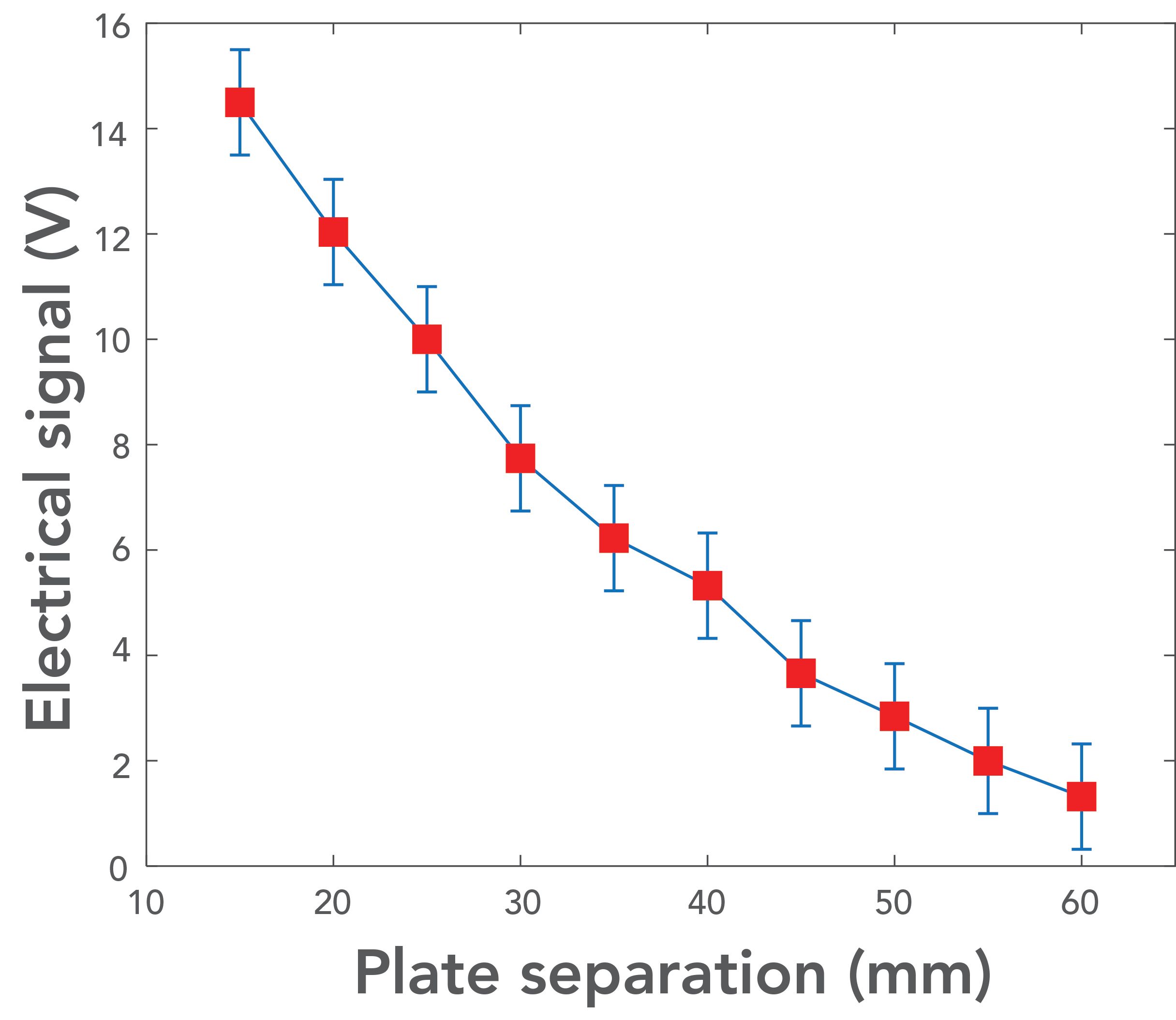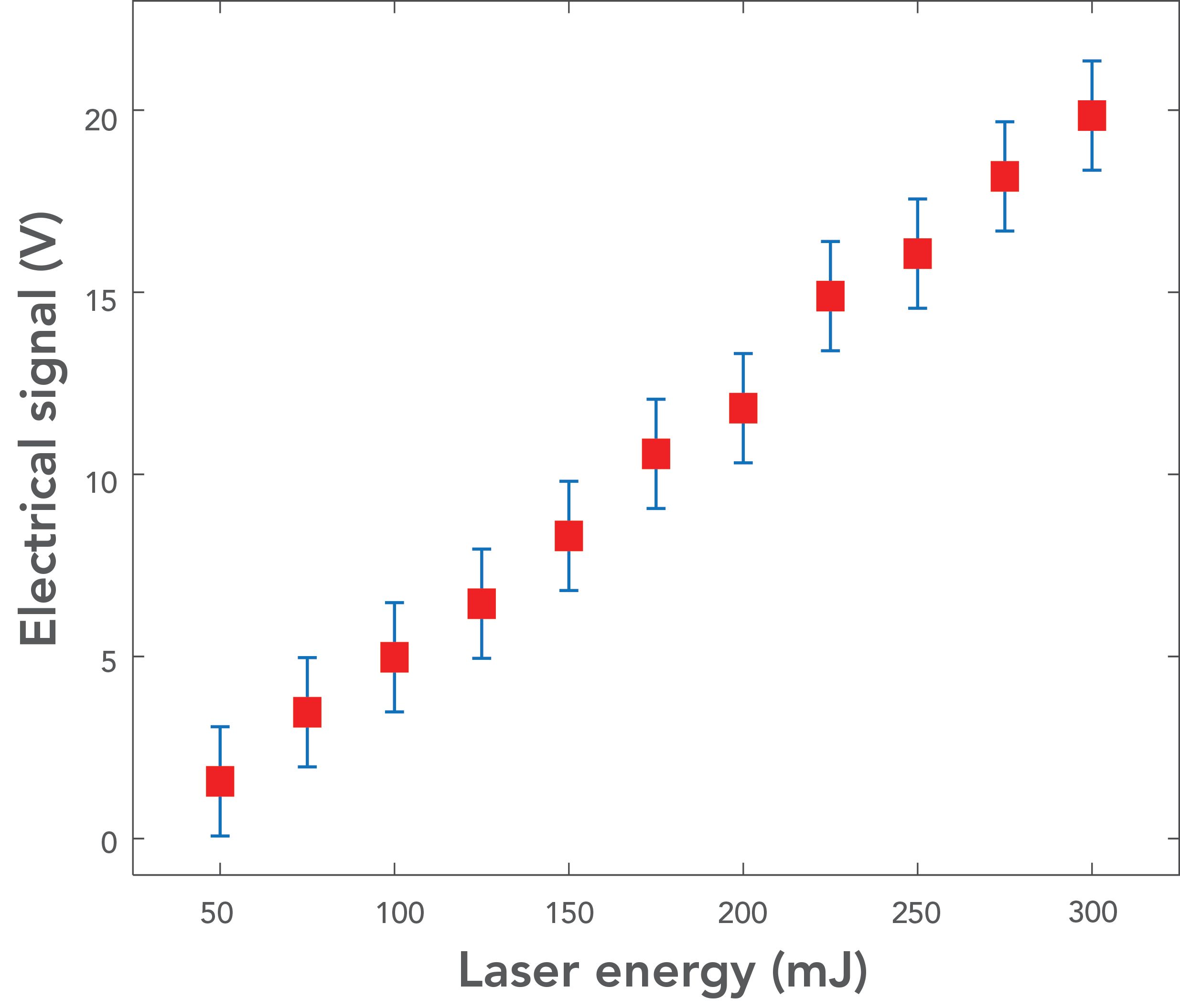 From Figure 5, we observed that, as the distance of separation between the two capacitors increased, the electrical signals decreased. The highest electrical signal was recorded with a distance of separation between the plates as 15 mm. From these results, we found that there was a sharp decrease in the electrical signal as the distance between the plates increased from 15 to 60 mm. Figure 6 depicts the electrical signals as a function of the laser energy. As can be seen from the figure, the electrical signals increase with increasing laser energy. At a laser energy of 300 mJ, the maximum electrical signal was recorded as 18.2 V. We also observed a linear relationship between the electrical signals and the laser energies. The plotting of the electrical signal against the applied voltage across the capacitor plates is presented in Figure 7. We also observed a linear relationship between the electrical signals and the applied voltages. It can be seen that the electrical signals increase with increasing voltage across the capacitor plates.